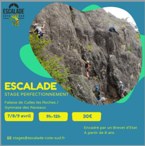 Le stage découverte, assurance incluse, vous permettra de découvrir l’escalade en site naturel (Culles les Roches), repli au gymnase des raveaux en cas de mauvais temps. Stage perfectionnement
